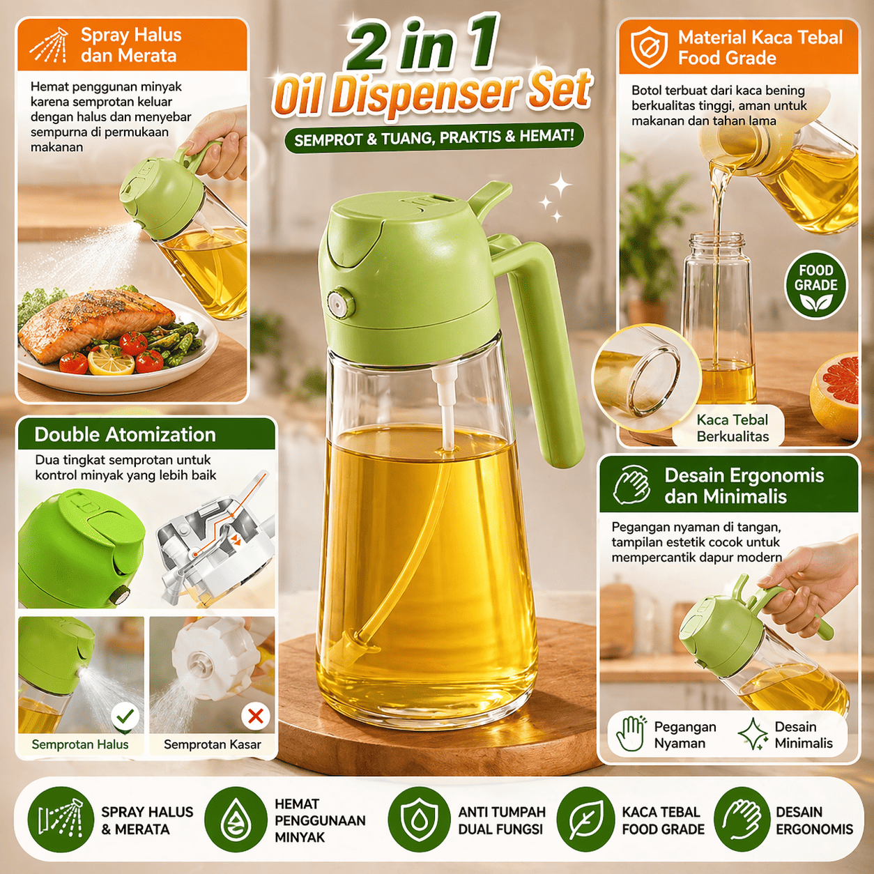 Botol minyak kaca spray 470 ml adalah wadah praktis dan higienis untuk berbagai kebutuhan memasak. Dilengkapi nozzle semprot yang menghasilkan kabut halus dan merata sehingga lebih hemat minyak, serta fitur dual fungsi untuk disemprot atau dituang langsung tanpa tumpah. Terbuat dari kaca tebal food grade yang aman dan tahan lama, dengan desain ergonomis dan minimalis yang cocok mempercantik dapur modern.