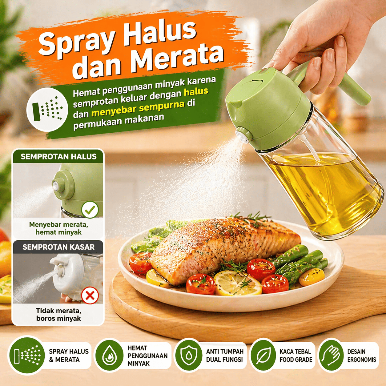 Sistem semprotan halus meratakan penggunaan minyak secara hemat, mendukung pola makan sehat bebas kalori berlebih.